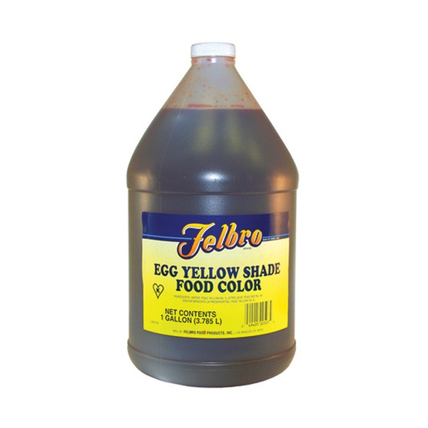 Egg Yellow Shade Food Color comes in a bulk case of 4 one-gallon bottles (3.785 L each). Perfect for bakeries, food service, and commercial kitchens, this high-quality liquid food coloring provides a vibrant yellow shade for icings, frostings, beverages, and desserts.